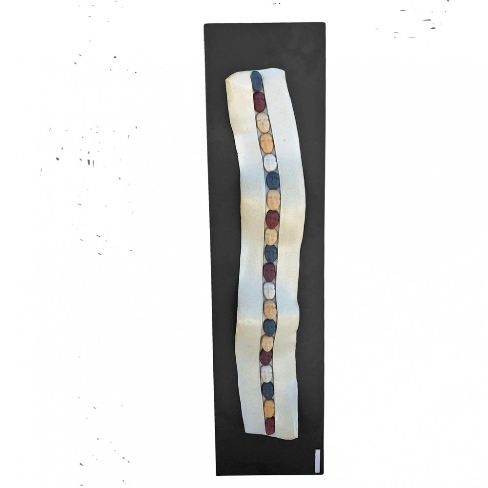 Επιτοίχιο - πρόσωπα σε κυματιστή κορδέλα σε ξύλινη κορνίζα . Χειροποίητη δημιουργία από πηλό υψηλής θερμοκρασίας .Ψήσιμο στους 1260°C. Επεξεργασία με υάλωμα στάχτης.
