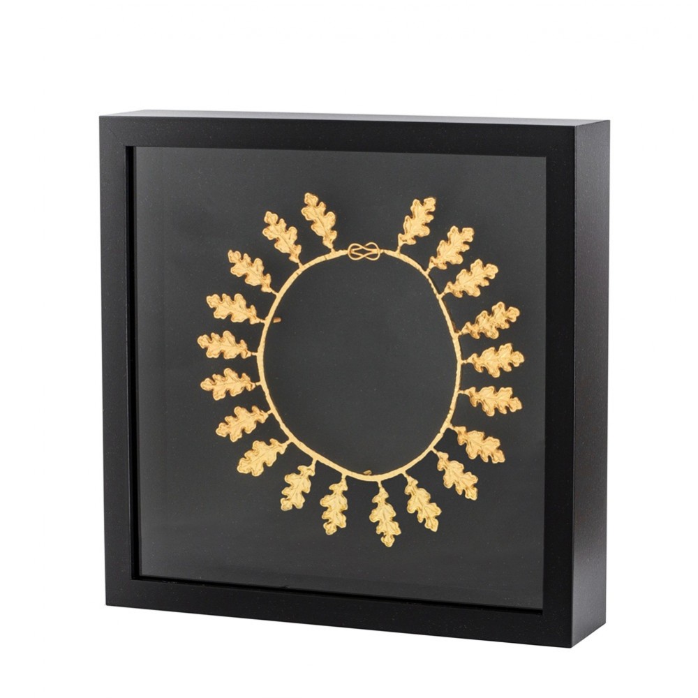 Χειροποίητο στεφάνι με φύλλα βελανιδιάς ορείχαλκο επιχρυσωμένο σε διάλυμα χρυσού 24 καρατίων και τοποθετημένη μέσα σε ξύλινη κορνίζα με τζάμι .