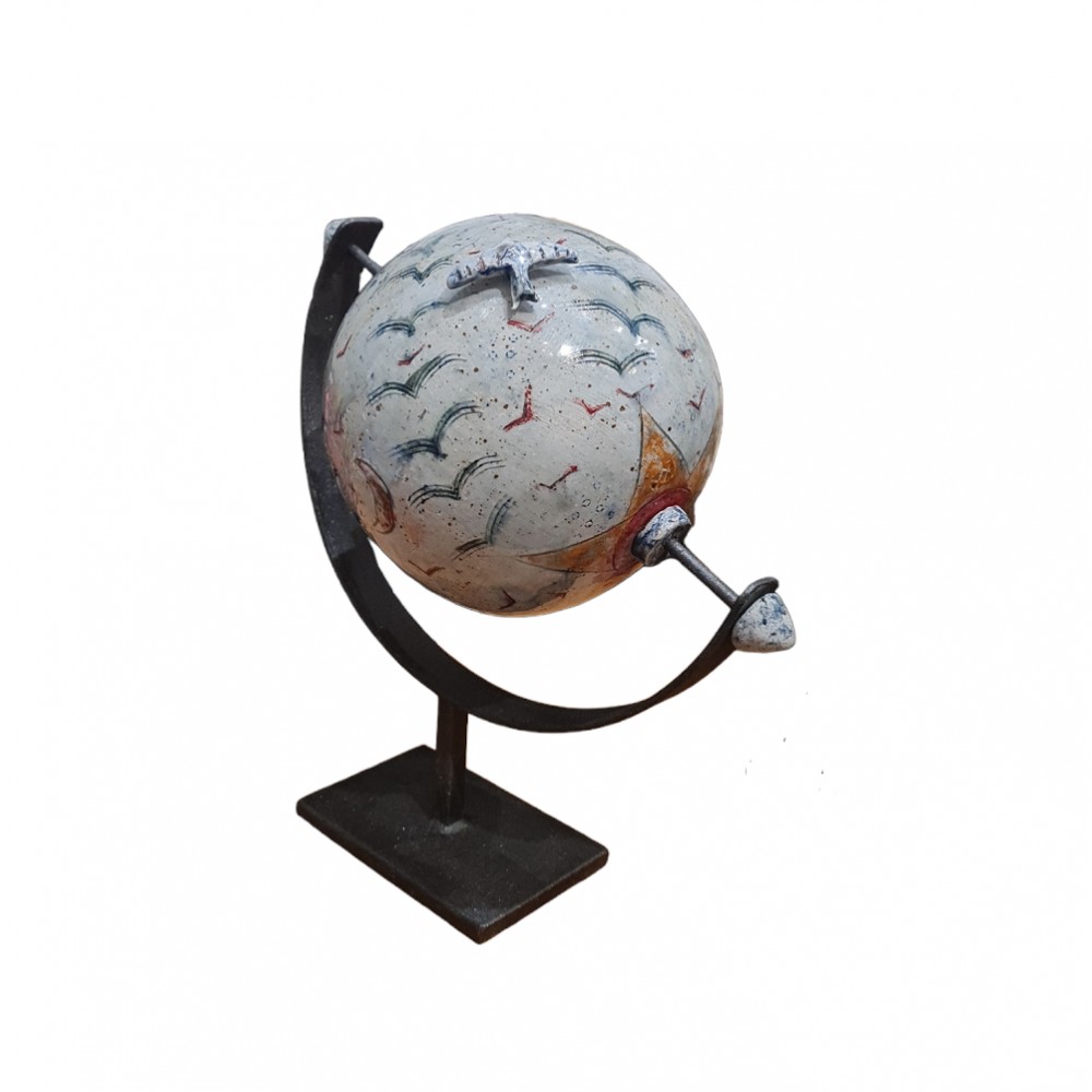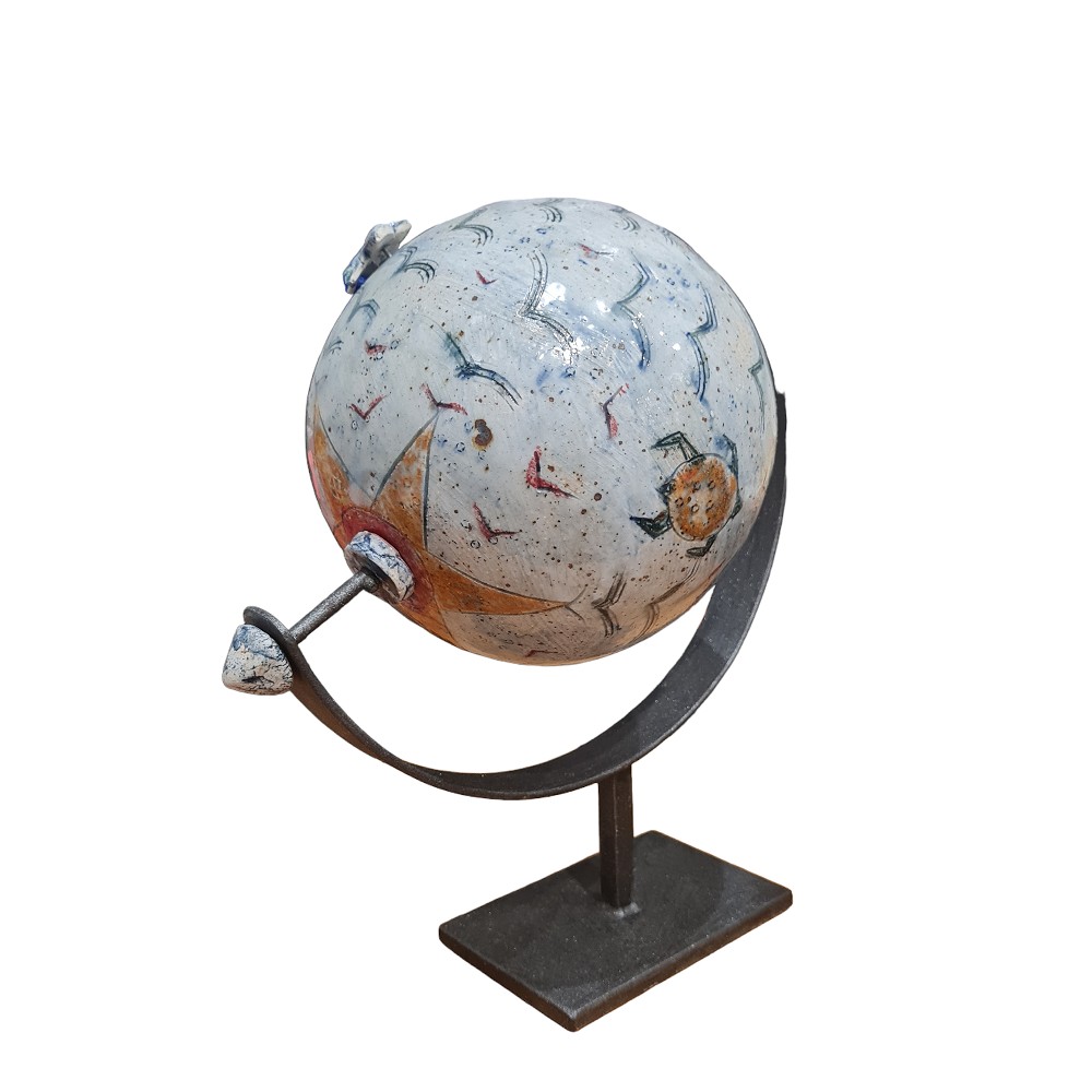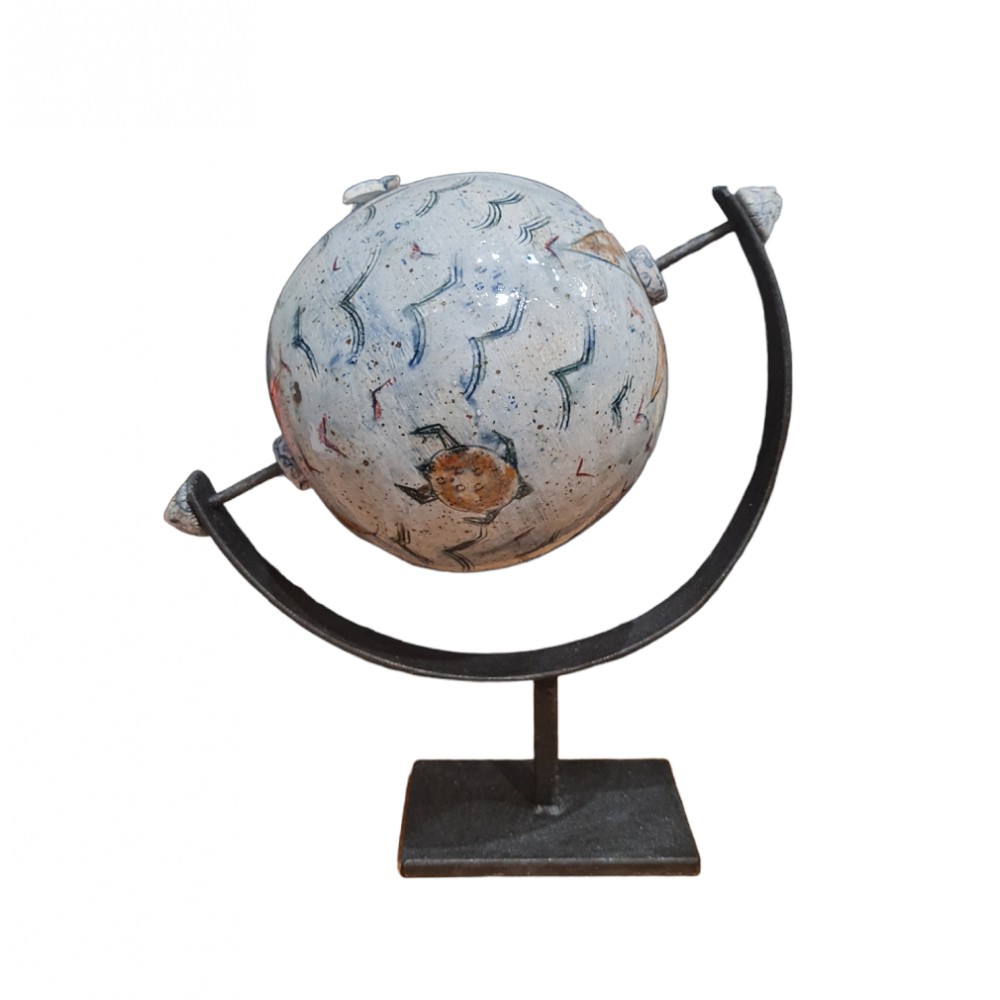 Ιδιαίτερη περιστρεφόμενη σφαίρα από πηλό stoneware, ζωγραφισμένη στο χέρι. Μεταλλική βάση. Ψήσιμο σε καμίνι υγραερίου 1280° C.