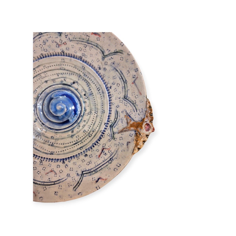 Μοναδική δημιουργία. Εγχάρακτη πιατέλα από πηλό stoneware ,οξείδια μετάλλων και επίστρωση πορσελάνης. Ζωγραφισμένη στο χέρι . Ψήσιμο με την τεχνική Raku (οξείδια μετάλλων) σε καμίνι υγραερίου στους 1280°C.