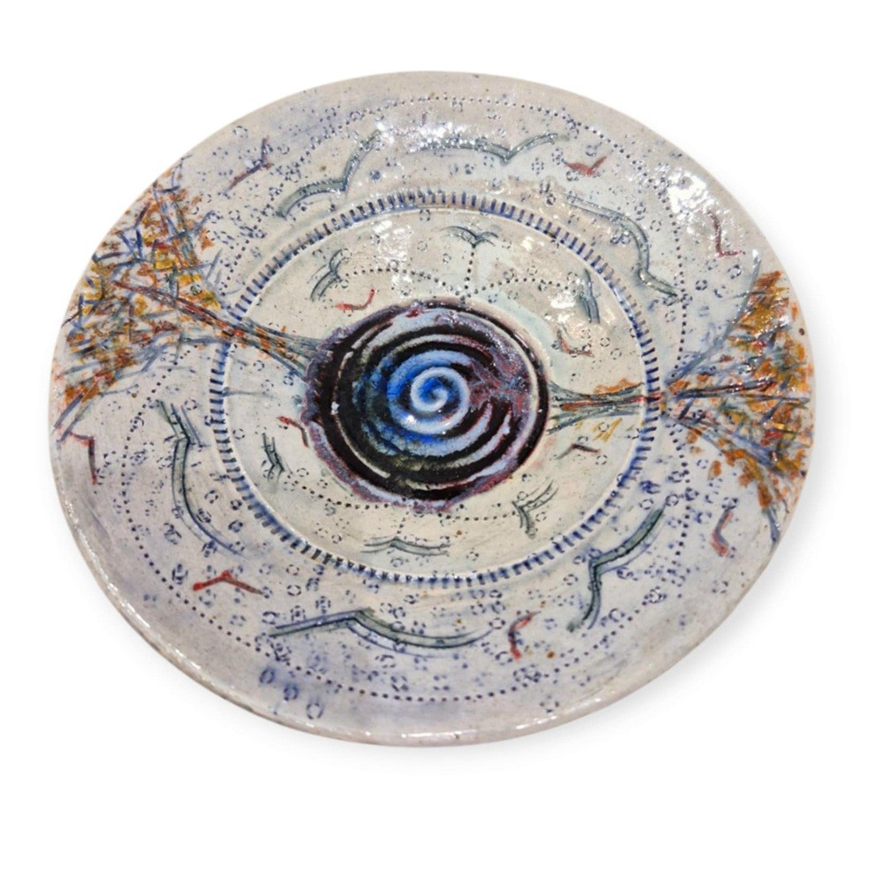 Μοναδική δημιουργία. Εγχάρακτη πιατέλα από πηλό stoneware ,οξείδια μετάλλων και επίστρωση πορσελάνης. Ζωγραφισμένη στο χέρι . Ψήσιμο με την τεχνική Raku (οξείδια μετάλλων) σε καμίνι υγραερίου στους 1280°C.