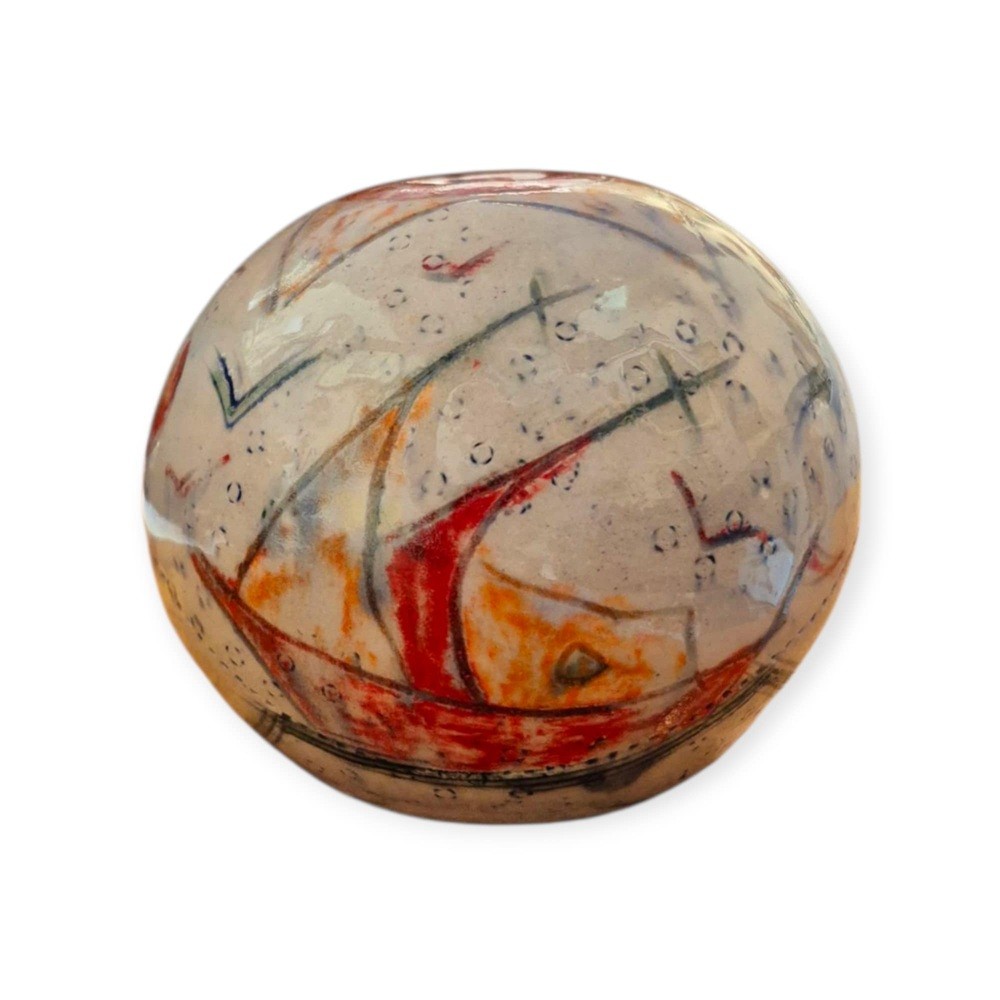 Κεραμική σφαίρα από πηλό stoneware, ζωγραφισμένη στο χέρι που απεικονίζει καράβια. Ψήσιμο σε καμίνι υγραερίου 1280° C.