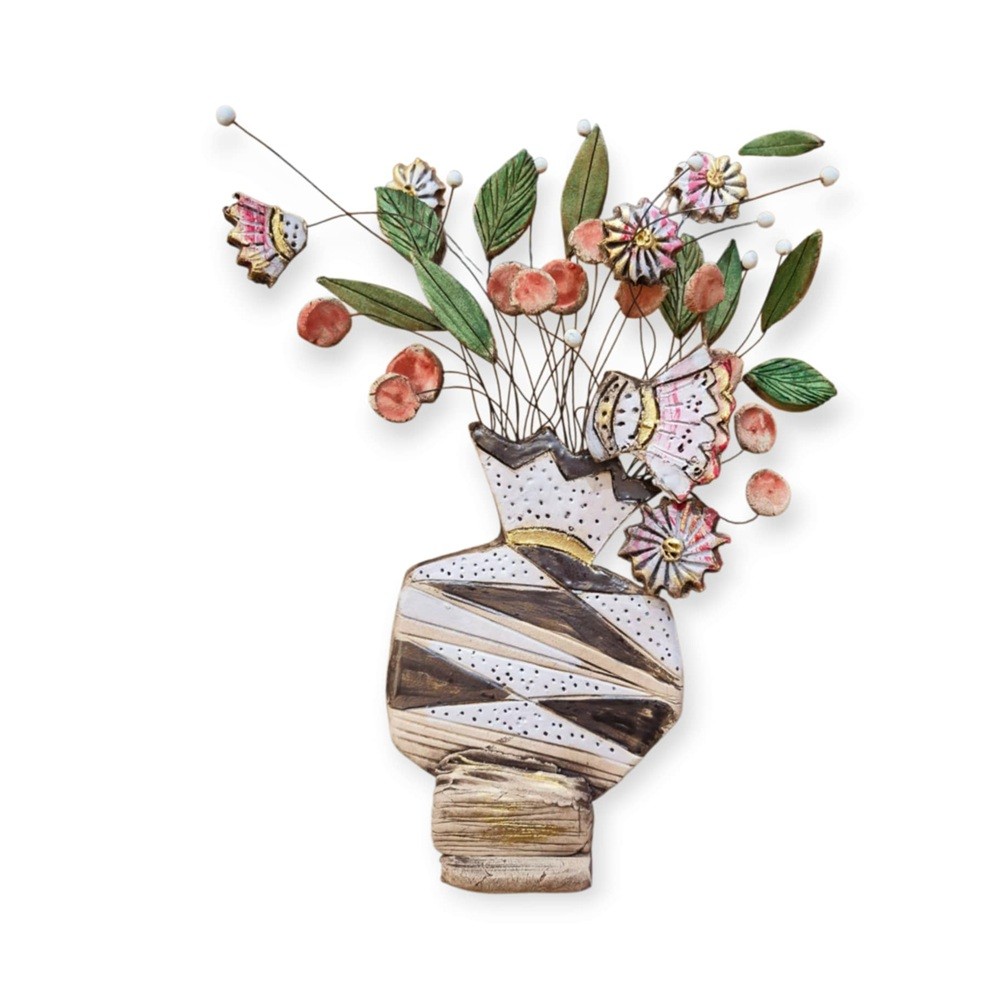 Επιτραπέζιο γλυπτό ρόδι πλούσιο με πολλά λουλούδια σε βάση από πηλό stoneware, ζωγραφισμένο με πυροχρώματα και μπαντανάδες.