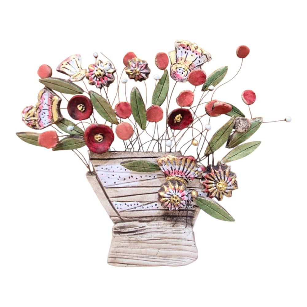 Γλυπτό γλάστρα με χρωματιστά λουλούδια δουλεμένο στο χέρι από την Μαρία Λαλαούνη . Μοναδική χειροποίητη δημιουργία από πηλό stoneware ζωγραφισμένη με απαλά γαιώδη χρώματα .