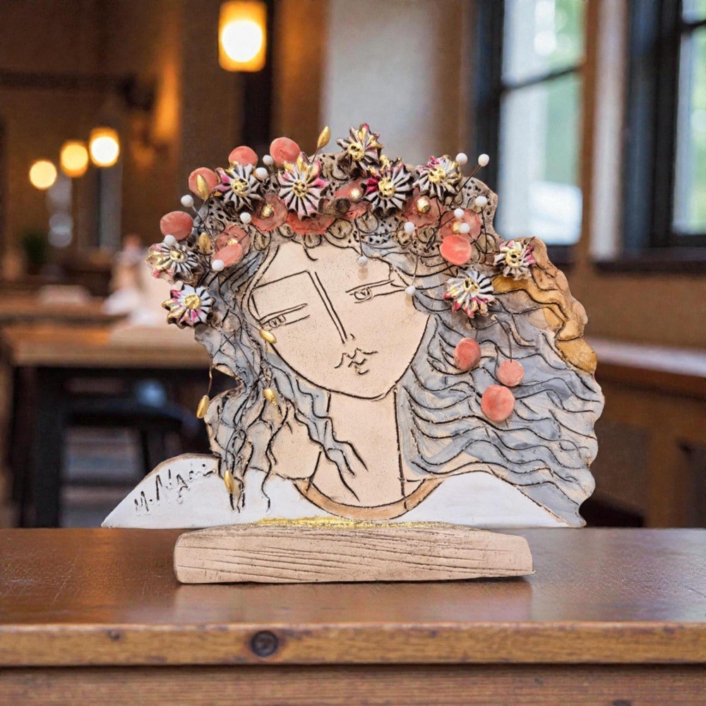 Γλυπτική επιτραπέζια δημιουργία από πηλό stoneware σε κεραμική stoneware βάση . Γυναίκα με λουλούδια ζωγραφισμένοη με πυροχρώματα και μπαντανάδες.