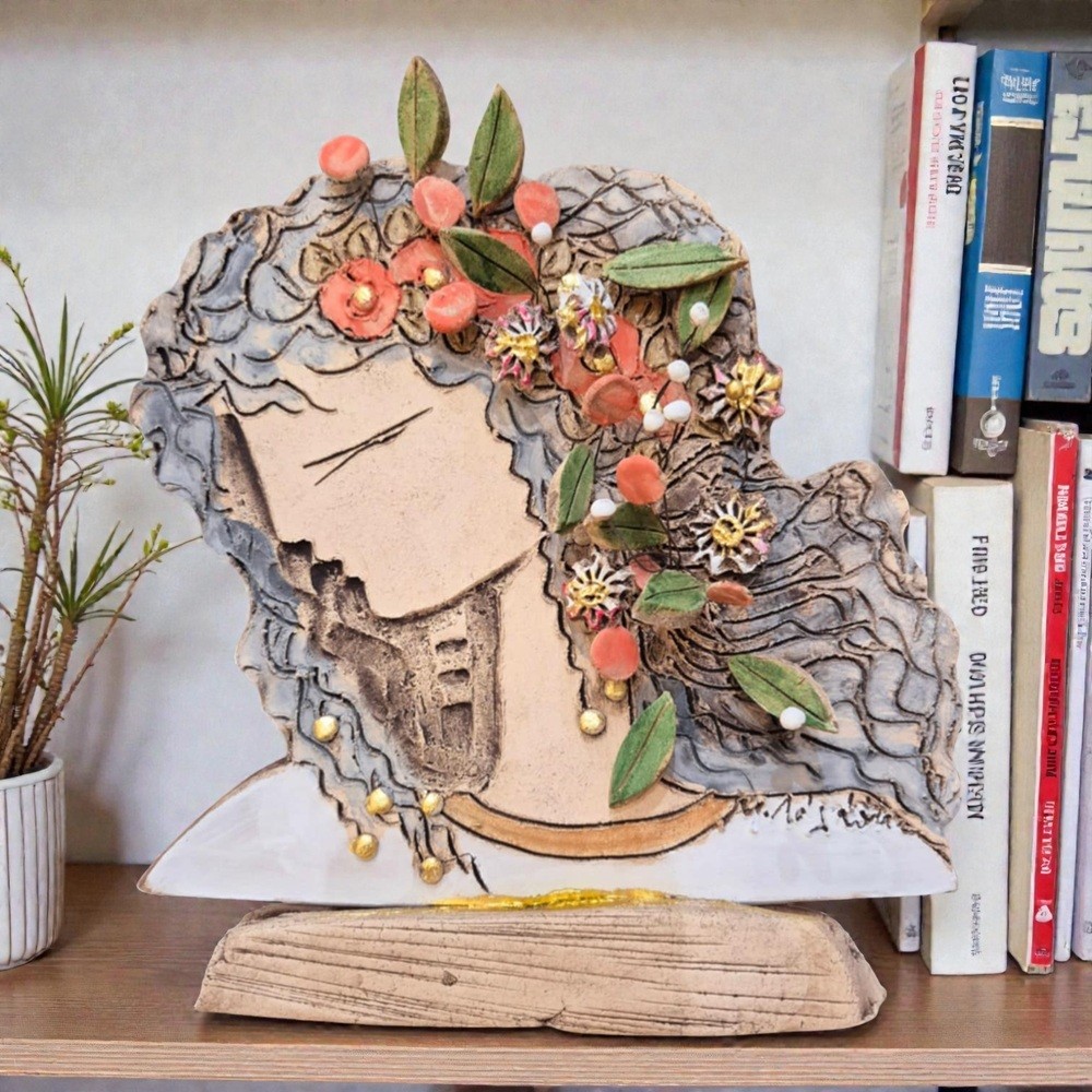 Γλυπτική επιτραπέζια δημιουργία από πηλό stoneware σε κεραμική stoneware βάση . Γυναίκα με λουλούδια ζωγραφισμένοη με πυροχρώματα και μπαντανάδες.