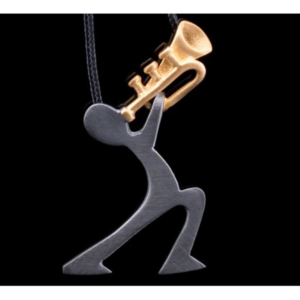 Μενταγιόν '' Μουσικός με τρομπέτα '' από ασήμι 925 και υγρό γυαλί. Το φινίρισμα του είναι ματ. Ειναι πλατινωμένο με μαύρη πλατίνα και χρυσό. Συνοδεύεται από νήμα 44cm με χειροποίητο κούμπωμα.