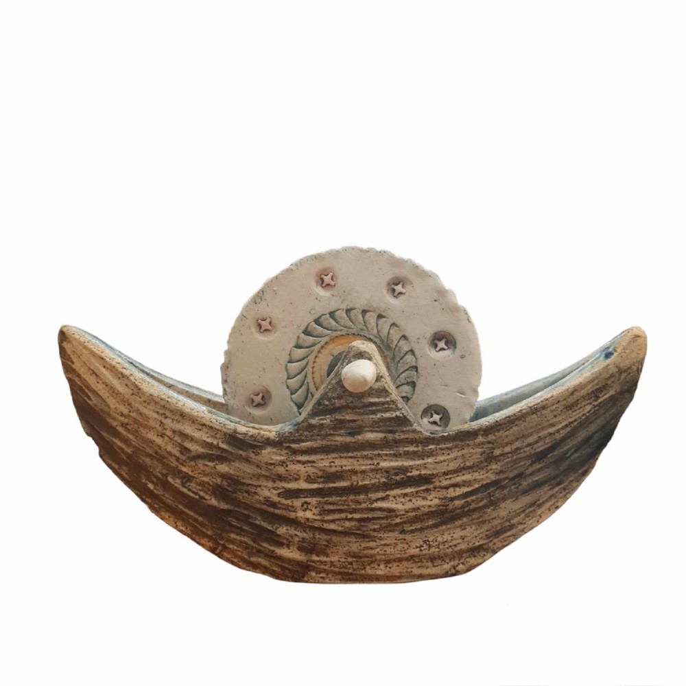 Stoneware ship with double-sided hand-painted porcelain rotative disc inspired by the Anticythera Mechanism.Fired in gas kiln of 1280° C.Unique creation.