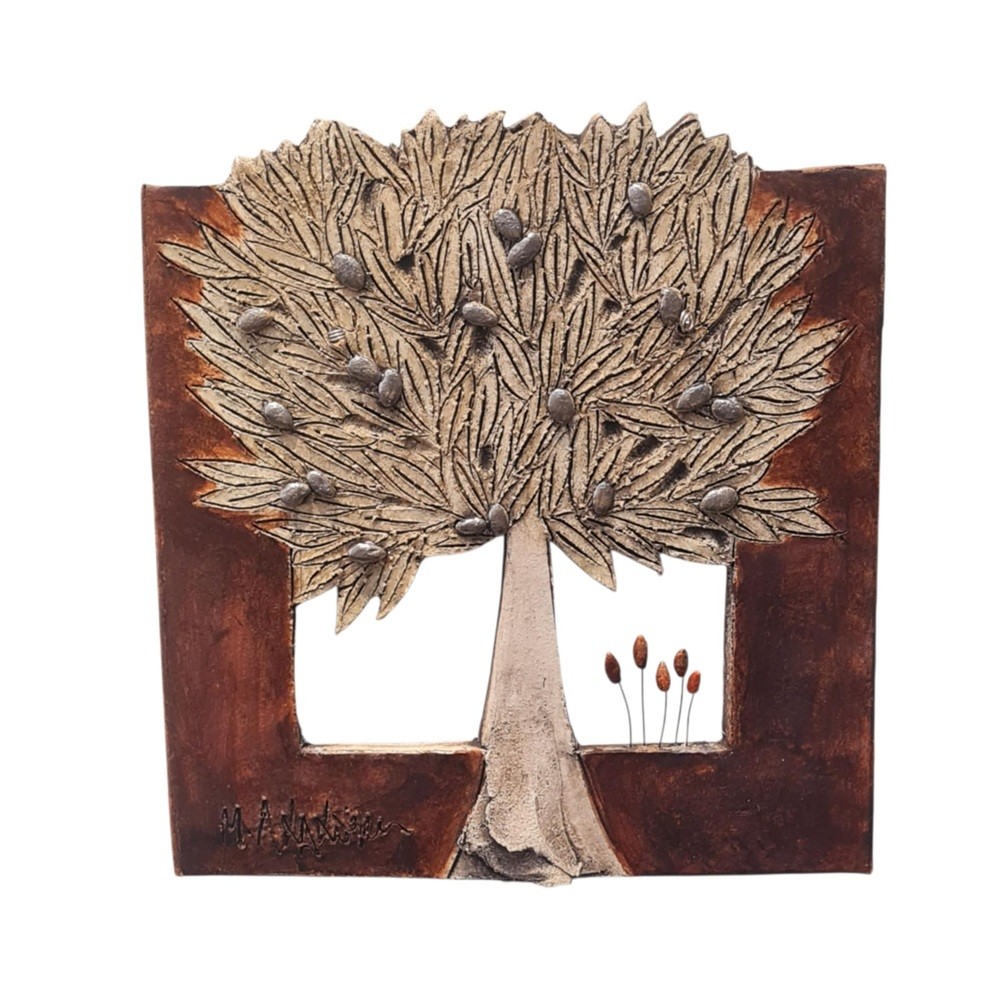Unique wall creation of stoneware clay.Empossed olive tree on frame with ceramic stains and coloured slips.