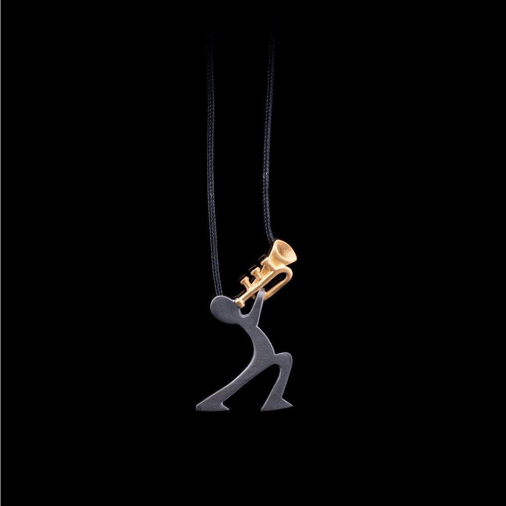 Pendant '' Trumpeter '' made from silver 925° .Its finish is matte and its plated with black platinum and gold.